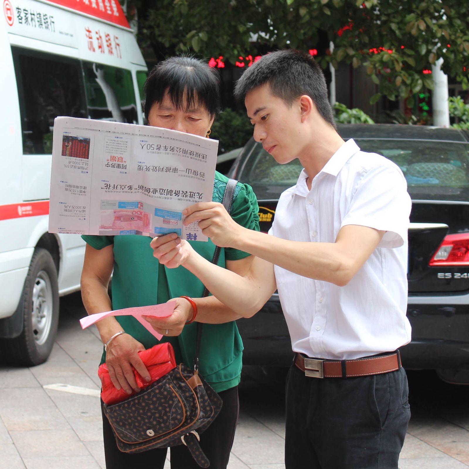 客家村镇银行在华侨城总行营业厅前以定点宣传的方式,向过往行人讲解新版人民币的特征和仿伪技术的变化等知识,获得了民众的一致好评。