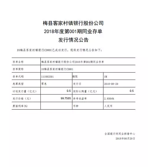 在中国人民银行梅州市中心支行的大力关心和指导下,2018年8月20日,客家村镇银行第一期同业存单(18梅县客家村镇银行CD001)在全国银行间本币交易市场成功发行。本期同业存单采用报价发行方式,发行规模0.5亿元,参考收益率2.8504%,期限1个月。