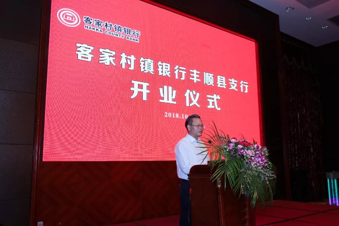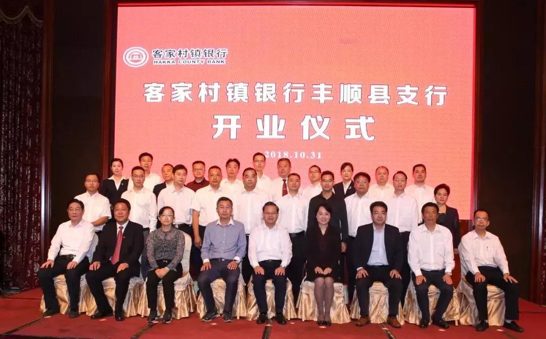 开业仪式由丰顺县人民政府副县长梁玉辉主持,中国银监会梅州监管局副局长段梅代表监管局宣读开业批复文件,客家村镇银行董事长李东强代表客家村镇银行致欢迎辞,中共丰顺县县委书记曾永祥、梅州市金融工作局局长肖卫华、人民银行梅州市中心支行行长黄昌隆、人民银行梅州市中心支行副行长朱冕、客家村镇银行董事长李东强共同为客家村镇银行丰顺县支行挂牌开业推杆启动。客家村镇银行董事长李东强为丰顺县工商联、丰顺县电声协会和茶叶协会进行综合授信,授信总额达8亿元人民币。最后,中共丰顺县县委书记曾永祥发表讲话,表示大力支持客家村镇银行丰顺县支行发展的同时,对客家村镇银行丰顺县支行支持丰顺县实体经济发展、助推建设生态富民强县寄予了殷切期望。