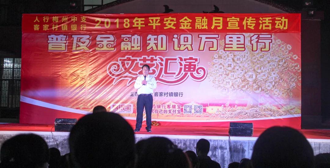 11月3日,由中国人民银行梅州市中心支行、客家村镇银行联合举办的“2018年平安金融月宣传活动”在梅南镇举行,活动通过文艺汇演的形式,利用舞蹈、歌唱、小品、朗诵等精彩节目,吸引了众多百姓参与。
