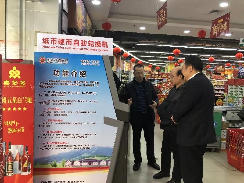 陈洁波处长一行冒着严寒驱车来到人民银行梅州中支和客家村镇银行联合建立的纸硬币兑换工作示范点——梅州喜多多超市新中店,实地了解梅州第一台布放在超市内的纸硬币兑换机使用情况,并就纸硬币兑换机布放工作中需要进一步解决的问题等与银行工作人员进行了详尽的沟通与交流。陈洁波处长对梅州创新开展纸硬币兑换机布放工作给予充分肯定,并提出了要积极宣传推广梅州在超市内布放纸硬币兑换机的经验做法。