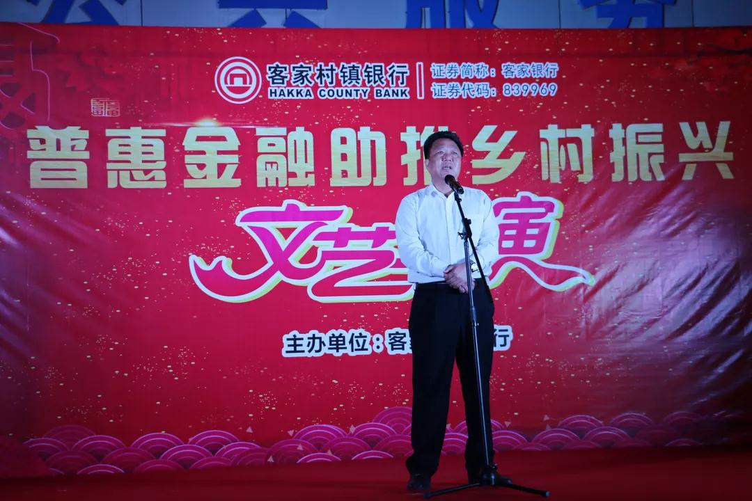 为深入贯彻落实党和国家关于乡村振兴战略的政策,推进普惠金融事业的发展,4月8日晚上,客家村镇银行”暨隆文分理处成立四周年文艺庆典活动在梅县区隆文镇公共服务中心举行。隆文镇副镇长古志文,客家村镇银行董事长李东强等出席了本次晚会。