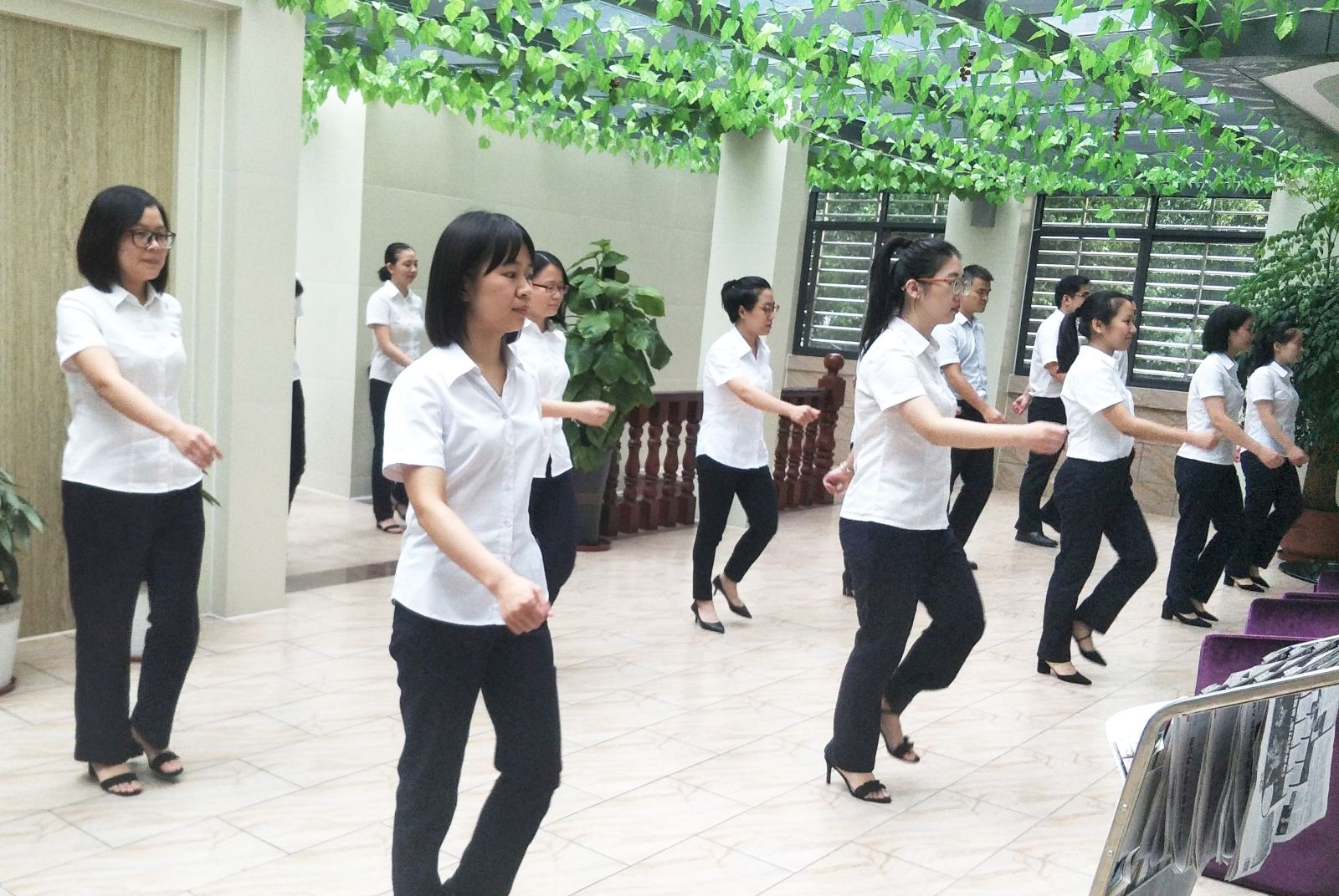 为积极推进工间操活动,客家村镇银行董事长李东强带头学习第九套广播体操,并有序开展对总行干部职工的培训,目前,工间操活动已形成一定氛围,成为总行干部职工喜闻乐见的一种健身方式。
